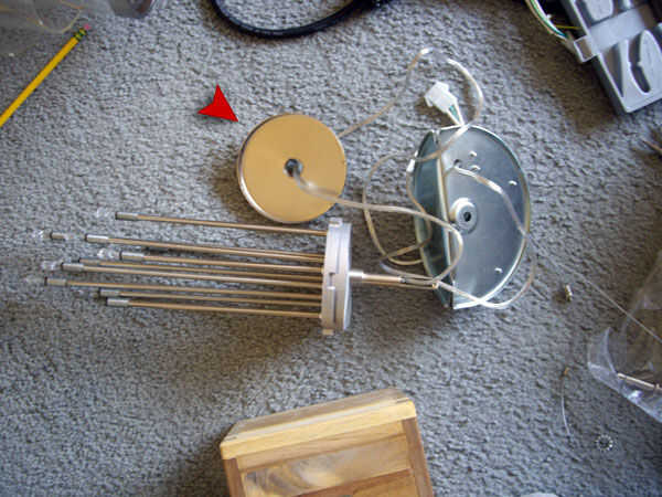 En photos1 y 2 abajo, es la parte de la lámpara a la que apunta la flecha roja (claridad: tenga en cuenta que la banda de metal plata ver en el borde exterior de la lámpara está colocada en el acrílico. La pieza a que refiero tornillos a la parte superior de la lámpara y se oculta de la vista por que la banda de metal).