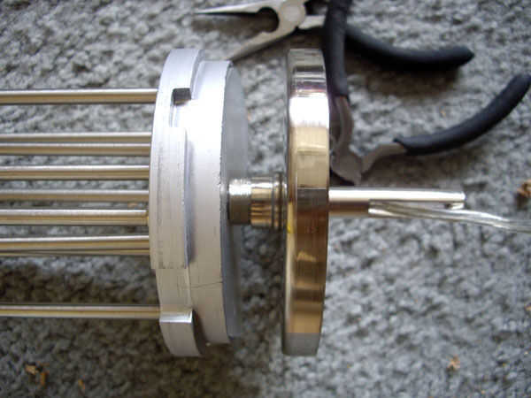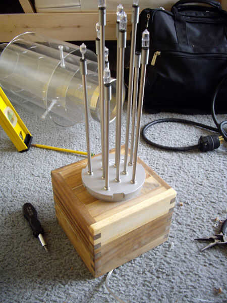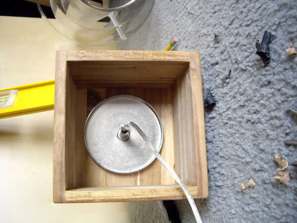 Sólo para tener una idea de lo que estamos haciendo, Foto 1 a continuación muestra cómo las dos piezas se vería sin la caja de madera en el lugar. Te cuenta cómo ellos pueden ser atornilladas juntas con su rosca original, aunque es "al revés" del diseño original. El espacio entre la tapa de la lámpara y este disco es donde la madera de la base de la caja será (el disco estará en el interior de la caja, como se muestra en la imagen 2 a continuación).