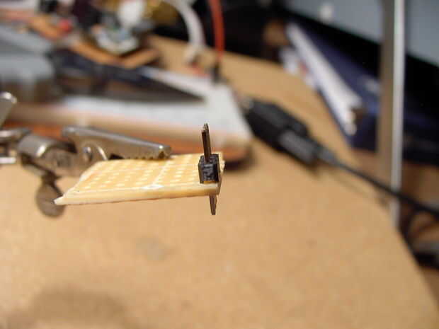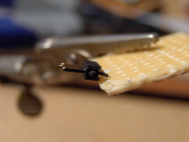 de la soldadura de zócalos y pines de cabecera recto cada vez.  Empezar por sólo dos puntos en una fila de encabezado pernos o un zócalo del ic, uno a cada lado de la soldadura.  Compruebe la alineación de lo pasadores/socket antes de soldar el resto