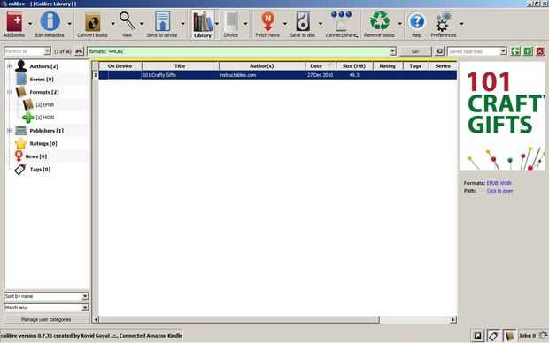 Seleccionar "formato > MOBI" a lo largo del lado izquierdo de Calibre y luego SELECCION el libro convertido. Haga clic en "enviar a dispositivo y disfrutar de tu ebook en tu Kindle de Instructables.