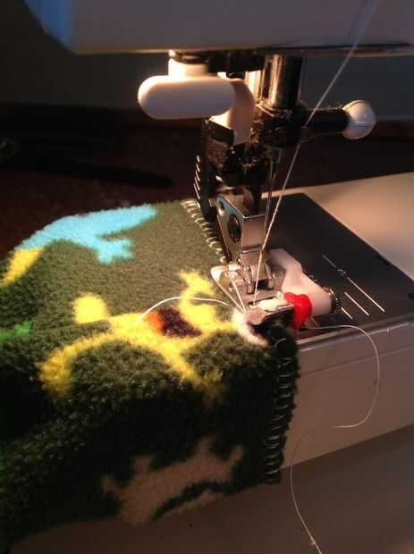 Moviéndose lentamente al principio, comencé en una de las costuras y sólo ayudó a impedir que el pijama se retuerza como la puntada vino círculo completo. Generalmente tenía el pedal al metal, pero con el pedal en la selección de "baja velocidad". Es importante ver la aguja y guárdelo para va justo sobre el borde del material, y el pie #3 ayuda con esto.
