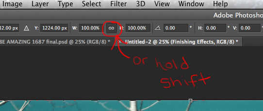• Presione Ctrl/Cmd T para transformación libre o ir a Edición > Transformación libre. Esto seleccione toda la imagen. Asegúrese de que usted presione el botón de enlace entre la altura y anchura o presionada la tecla Mayús mientras arrastra para mantener la relación de aspecto de la misma y no estirar la imagen.
