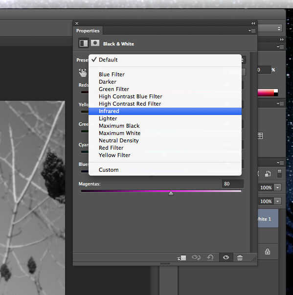 • En el cuadro de diálogo blanco y negro, seleccione el preset infrarrojo.