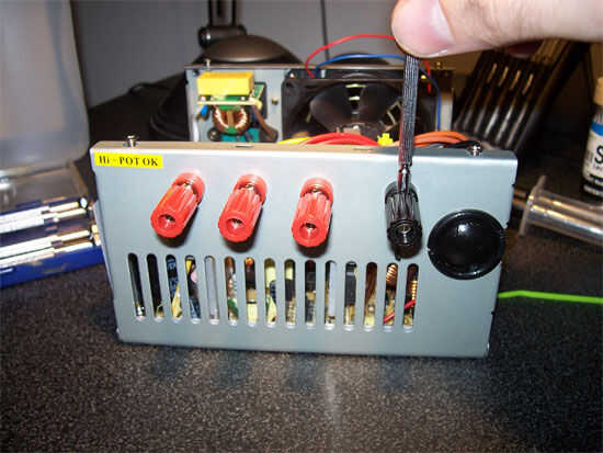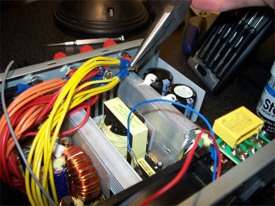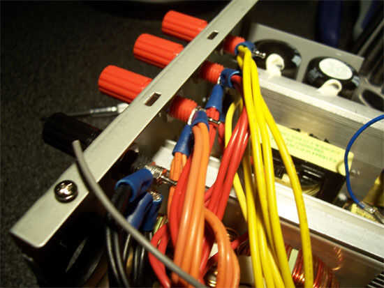 Instalar los terminales de lengüeta en la parte posterior de los terminales de conexión y apriete hacia abajo bien y apriete con los alicates. Esto puede ser difícil si usted tiene una fuente de alimentación de alta potencia, usted tendrá más alambres. Los postes se muestra en estas fotos pueden tomar es 4 terminales de lengüeta.