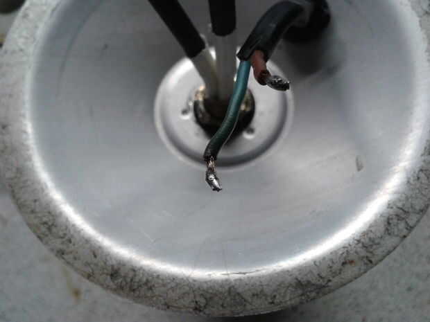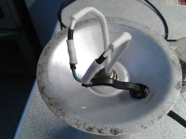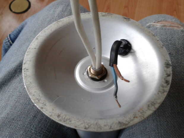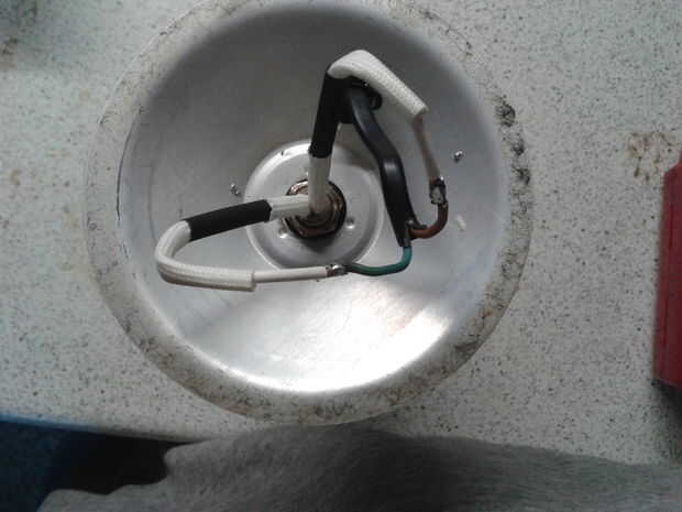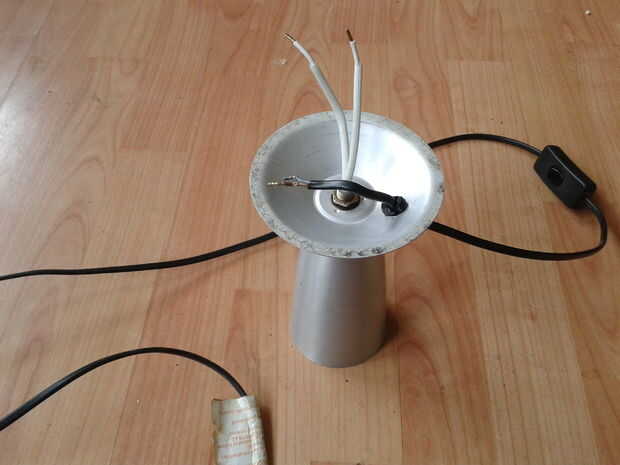 Una vez que la base es reassmbled la forma vino aparte con el sostenedor de bulbo de reemplazo en lugar del cableado necesario para conectar iba a usar un pedazo de bloque de chocolate y atornillar los extremos de los cables pero la base es bastante baja por lo que opté para cables retráctil cubierta de soldadura y del calor y de yapa el aislamiento blanco que salió de los cables donde entraron al portalámparas original.
