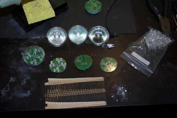 Cada tarjeta utiliza 12 LEDs. Utilizar 20.000 MCD led de con tapas planas. Usted puede encontrar estos en ebay bastante fácilmente. He pagado creo que 20 bux para 200 de ellos.