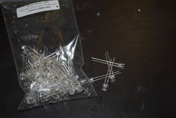 A continuación nos suelde el LED. ahora hice estos en grupos de seis. Tres LED en prestar atención a las marcas de ánodo y el cátodo en el PWB de la materia. Mucho es anode(+) y plazo de ejecución corto es cathode(-) cosas tres en frente de los tres primeros y voltee el PCB para que los cables de LED están accesable. La soldadura y acortar los conductores. Ahora soldar los 6 restantes de LED.