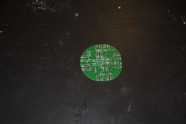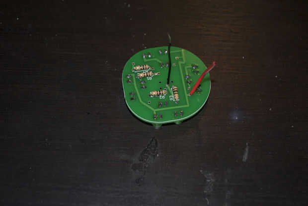 La vía que está directamente en el centro es el punto de tierra. Esto se puede encontrar saliendo de R3 (hay varios puntos de la tierra realmente pero este es más fácil). Soldar un cable negro en esta vía. Uso un calibre lo suficientemente pequeño como para caber. (inadveratly utiliza un agujero más pequeño que deseaba---usted puede solucionar esto en el archivo del PCB antes de enviarlas juntas hacia fuera para facilitar este paso). Ahora encontrar el rastro desde el ánodo del LED 7. Se verá una mayor vía saliendo de este rastro. Soldar un cable rojo aquí te 12V entrada.