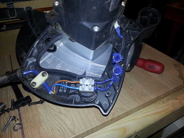 Utilice un bloque de terminales para conectar los cables directamente uno al otro... en este caso puentear el interruptor de disparo y la sierra encenderá cada vez que se conecte a la electricidad.