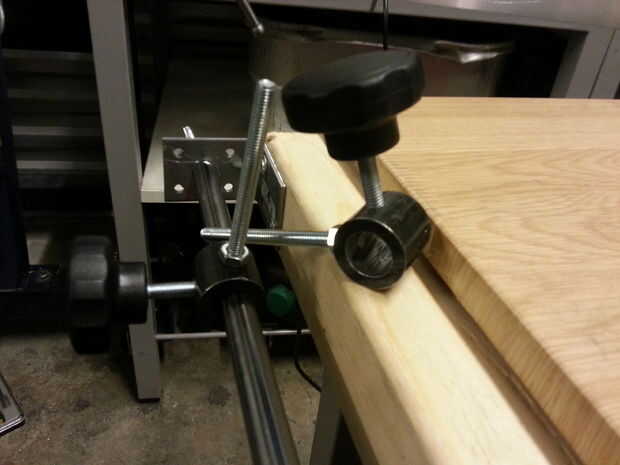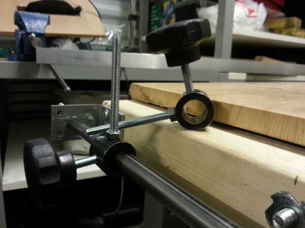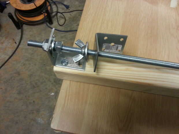 Una vez que se asegura de los soportes de la pieza de madera (uno en cada lado), seguir adelante y Monte la varilla roscada en los orificios de la abrazadera.