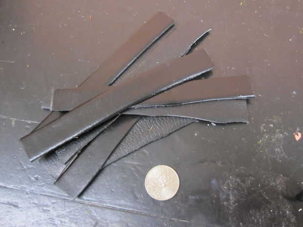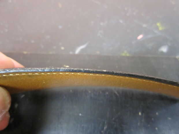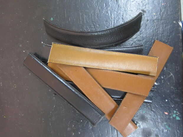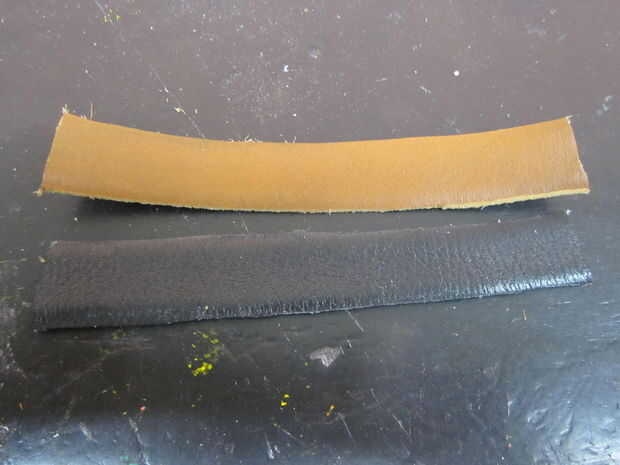 Una correa de cuero típicos (como estos) es dos tiras de cuero pegada y cosida. Las correas que tenía eran dos negros cosidos sobre brown (Foto 3). Una correa es suficiente cuero para hacer una pluma, siempre utilizas ambos lados de la correa. Quería un lápiz negro, así que necesitaba dos cinturones.