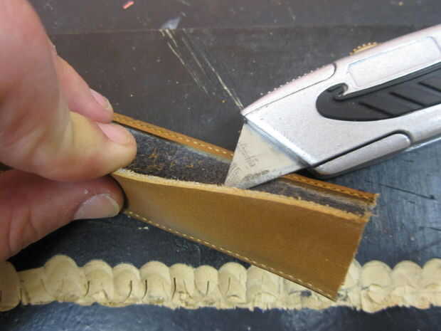 Utilice un bisturí para cortar los extremos de las correas para quitar la hebilla y la parte de la cinta con los agujeros. Éstos pueden ser desechados. Cortar el resto de la cinta en tiras de seis pulgadas (Foto 2). Nota: Traté de cortar la cinta con una sierra y una cuchilla de corte rotativo - no funcionan tan bien como mi bisturí, use una cuchilla afilada.