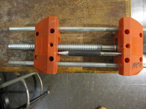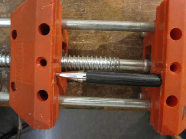 Mermelada de ajuste la tapa de la pluma en uno de los tubos usando un tornillo de banco (Foto 3). Mermelada Coloque el mecanismo de giro en el otro extremo de ese tubo (foto 4). Nota: Prueba el mecanismo de giro varias veces como mermelada ajuste en para asegurarse de que usted no sobre extenderlo. Jam en hasta que la punta se tuerce hacia fuera la cantidad que desee (Foto 5 - prefiero puntas de pluma larga).