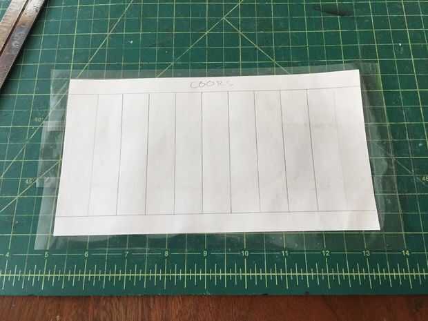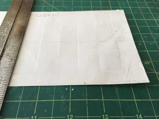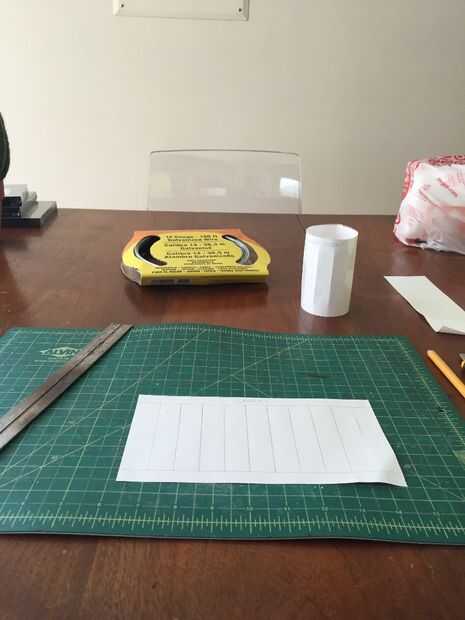 Medida de la circunferencia de la lata y la altura de la parte principal del cilindro. Entonces traducir estas medidas en un rectángulo en papel normal. A continuación, la marca de la distancia que desea que las ranuras de la parte superior y la parte inferior del cilindro. Luego, cubrir toda la hoja con cinta adhesiva. Se trata de hacerlo apretado del agua. Encuentra el ancho de sus espacios de raja - esto debería ir en su circunferencia un número entero de veces y cortar las ranuras con la navaja Xacto. Usé 1/2 rajas y detuvo los cortes a 1/2" de la parte superior e inferior del rectángulo.