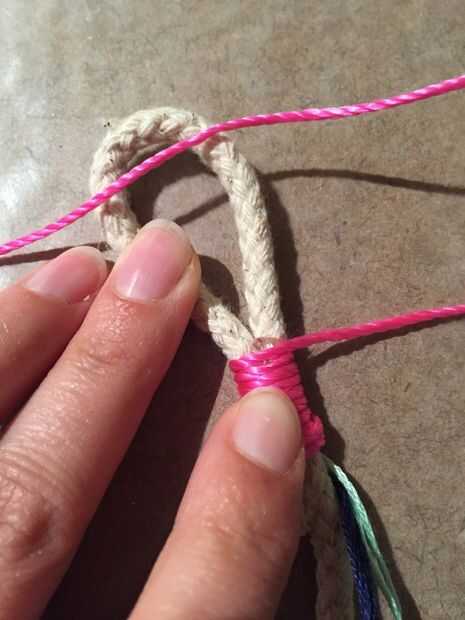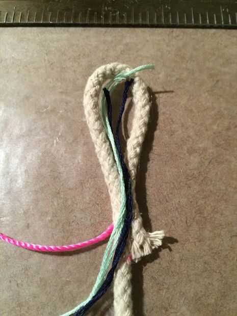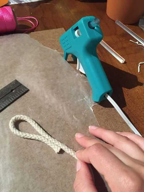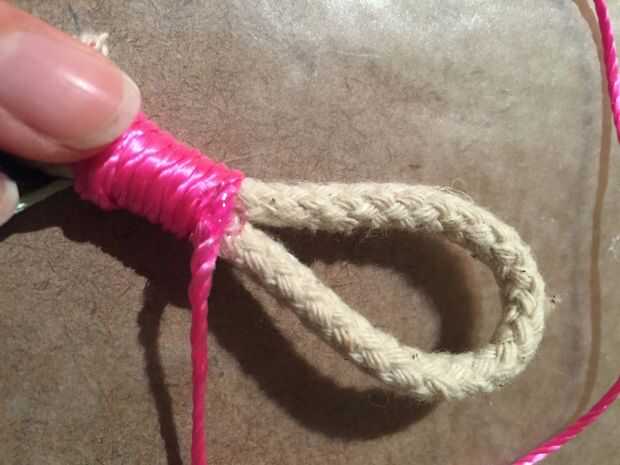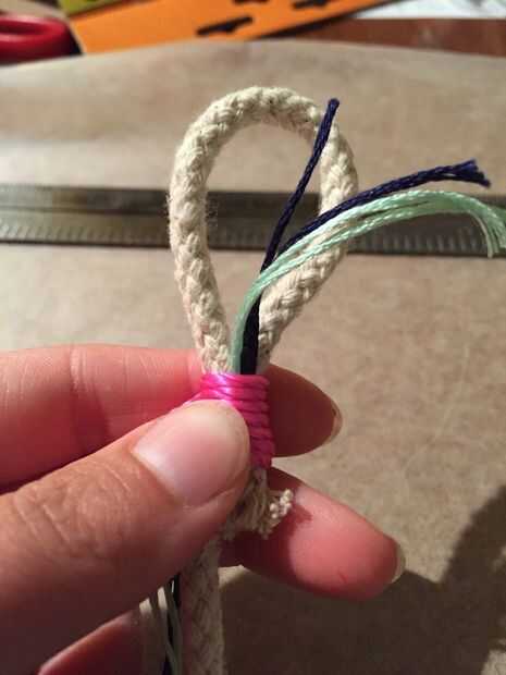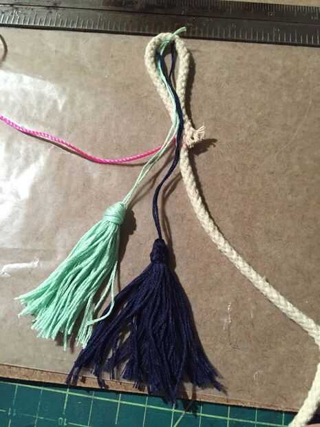Para mis bucles, pliega una sección de 6" a sí mismo y había conectado con una tira de 1" de pegamento caliente, dejando un bucle de 2". Luego envuelve la sección 1" pegado con línea de mampostería. Me encanta el color rosa neón. Es mucho mejor que el hilo rústico. Tarros de Mason son sobre la gente! Para el final los bucles, pegué un par de mis borlas en antes de envolver con la línea de mampostería. El diseño de Anthro utilizado 3, pero 2 era todo pude de repuesto, porque por supuesto, JoAnn funcionó fuera de la marina de guerra utilizaba en el acabado correcto. Tiene el mismo color en un hilo más grueso, menos brillante, pero quería ser consistente. Mi borlas brillantes de la marina de guerra están en el extremo.