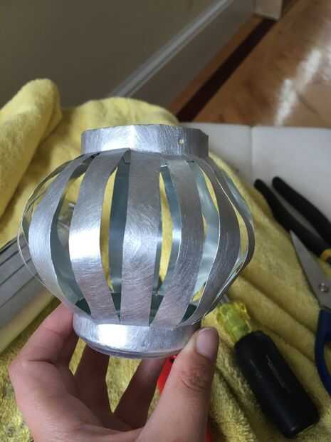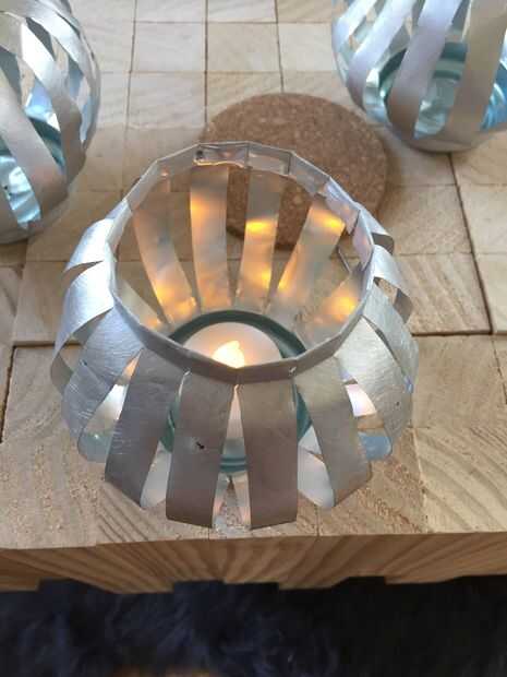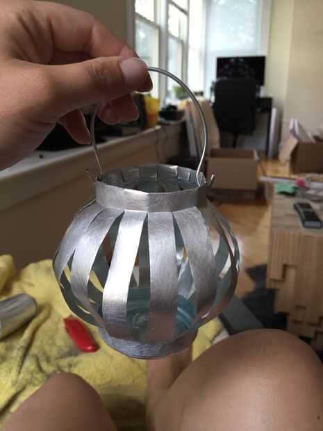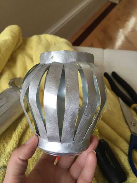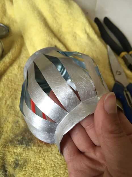 Inserte un destornillador de cabeza plana en las ranuras de la can en los extremos y doblar los listones de nuevo de la lata. Que tienes las manos pequeñas como yo, y usted puede conseguir sus dedos en doblar aún más estos listones de la lata. Se siente como una trampa para mapache, ¡ cuidado! También solía el mango de mi mango abolladura en la parte inferior de las latas hacia fuera, así que mejor que aceptarían las luces de té.