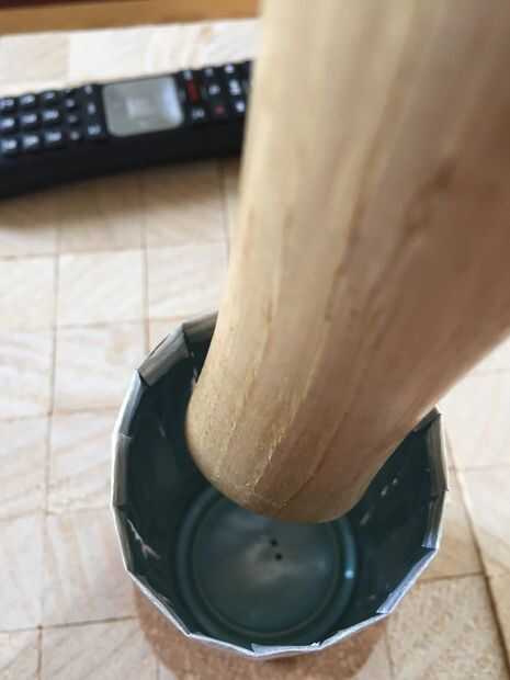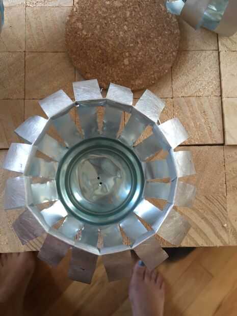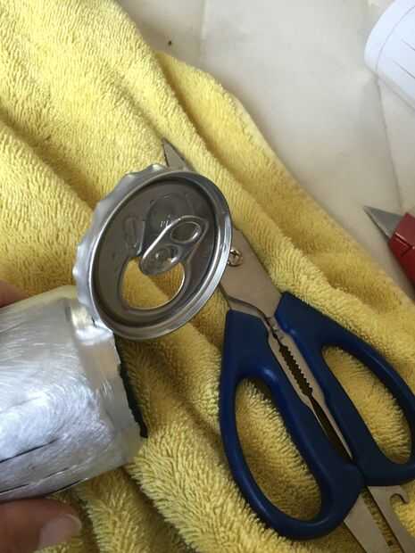 Utilice su cortador de caja fuerte para sacar la tapa como se muestra. Cuando la tapa es finalmente, utilizar las tijeras u otra herramienta de corte para cortar ranuras al nudillo de lata, como se muestra. En los orificios, cortar un triángulo, como en la foto. Plegar las nuevas pestañas.
