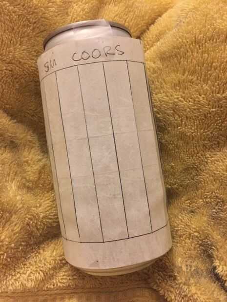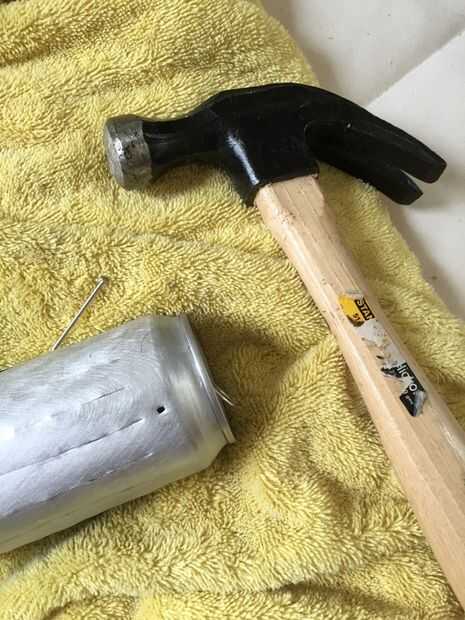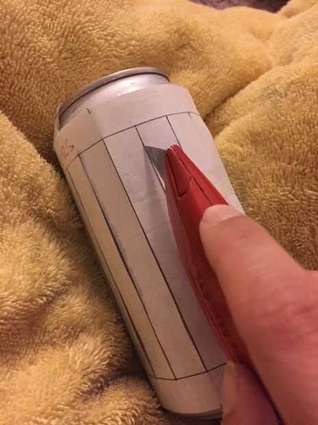 Cuando tienes una congelada, arena puede todo listo para, toalla apagado un poco y deslice la plantilla en. Prueba con cinta adhesiva la plantilla para el poder si se puede. Cuidadosamente y con un muy fresco, sharp hoja de afeitar en el cortador de la caja, corte la lata a lo largo de sus guías de corte. Retire la plantilla y hasta la raja termina hacia fuera si es necesario. Utilice un martillo y clavo para perforar dos agujeros en la parte inferior y dos agujeros uniformemente espaciados en la parte superior de la lata, como se muestra.