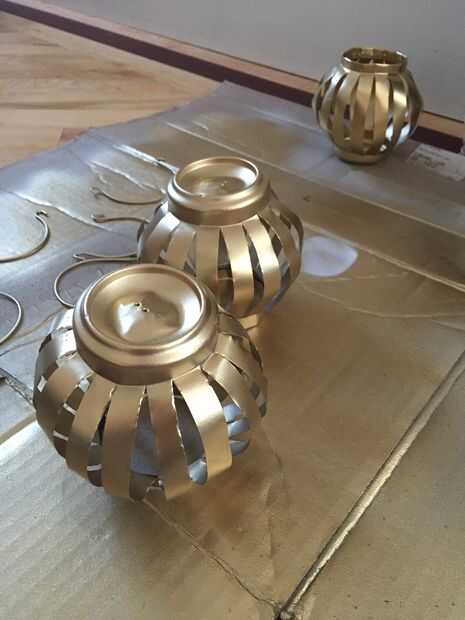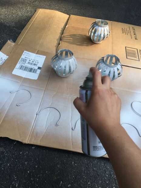 Ahora estás listo para preparar y pintar. También hice los ganchos de alambre. Nota: planeo tener 5 linternas, pero solo tuve 3 listo para la pintura cuando leí que el domingo iba a ser el último día de baja humedad durante al menos una semana, así que decidí 3 sería bueno por el momento.