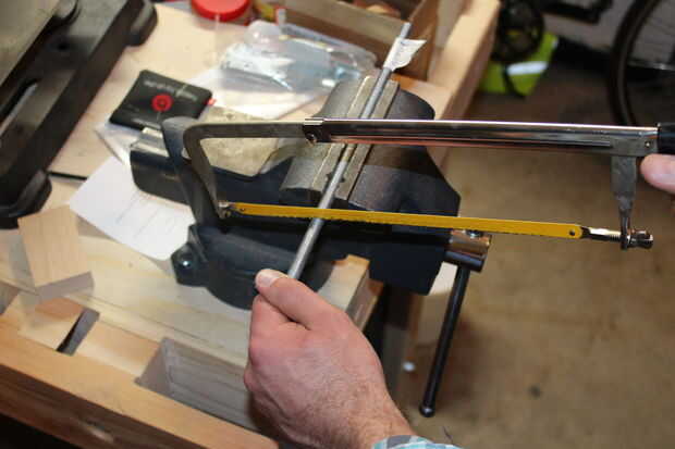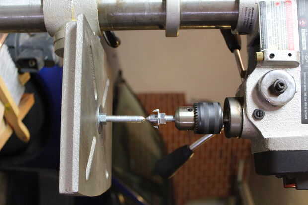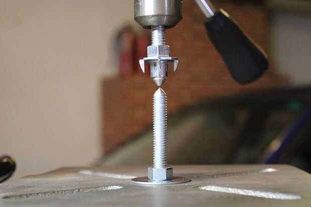 La varilla de 3/8 restantes se monta a través de la bodega del centro de la mesa del taladro usando una tuerca y una arandela a cada lado de la mesa. Esto apoyará el extremo "inferior" de la verdura mientras trabajamos en él.