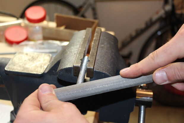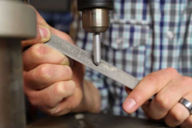 En primer lugar, un pulgadas par de varilla roscada se corta con una sierra para metales. No me cuidado medir esto, pero quería la pieza a ser lo suficientemente largos para asentar en el mandril y sobresalir 1 a 1,5" de la tirada. Después se corta la barra, la punta de la varilla se presenta aproximadamente a un punto. Esto se se pinchó en el vehículo un poco más tarde, por lo que lo hace partir un poco menos. El punto también nos ayudará a centrar la pieza vegetal. Después de presentar aproximadamente el punto en la varilla roscada, la barra se monta en el portabrocas del taladro, el taladro se encienda, y el archivo se utiliza para llevar la varilla roscada a un punto. Ahora mismo, la varilla roscada es la pieza de trabajo, y la prensa del taladro es un torno vertical, de tipo. Esto es rompiendo toneladas de tienda clase las normas de seguridad, por lo que no recomiendo, salvo para decir que funcionó. Proceda bajo su propio riesgo aquí.