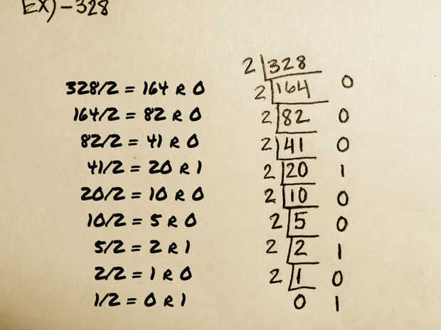 Tomar el número, ignorar el signo negativo y dividir el número por 2 y escribir el resto a la derecha como se muestra en la imagen. (En la foto 'R' está parado para el resto.) Incluso si el resto es 0, escriba abajo a la derecha. Ahora, seguir dividiendo cada cociente por 2 hasta que zero es el cociente y seguir escribiendo el resto hacia la derecha. Es mejor seguir esta división hacia abajo escribiendo cada cociente bajo del cociente anterior como se muestra en la imagen.