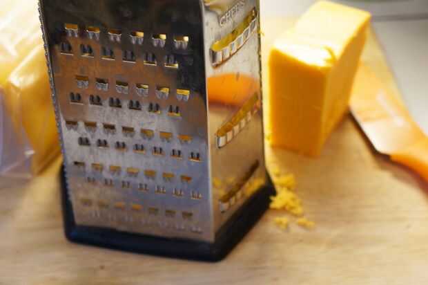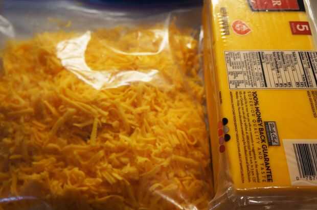 Para ahorrar dinero comprar queso en paquetes de 5 libras. Requiere trabajo de preparación, por lo que he empezado a desmenuzar el queso con las parrillas grandes y pequeñas por lo que puedo ahorrar tiempo y dinero. Mi marido generalmente rebanadas el queso para mí para bocadillos.