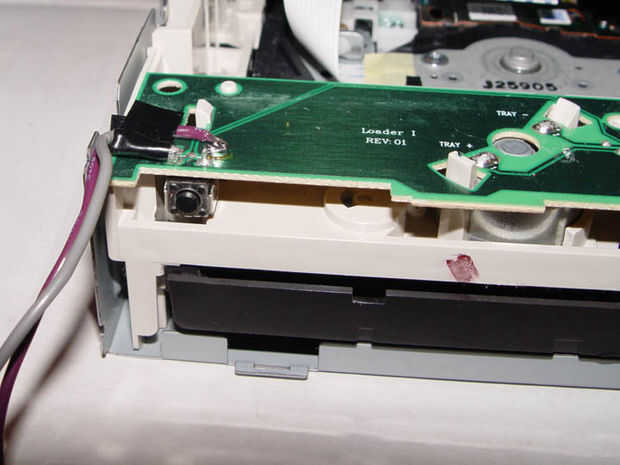 5. Conecte el cable de alimentación botón de eject al contacto apropiado en el circuito delantero. Usando una multímetro prueba que el contacto está aislado de tierra cuando el botón se levanta y tiene continuidad a tierra mientras se presiona el botón.