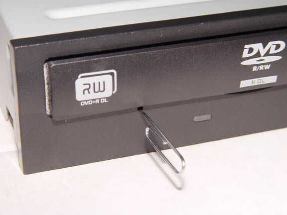 2. Retire el bisel frontal de la unidad de DVD. Utilice el clip para liberar la bandeja de DVD. Presione las lengüetas accesibles de la cubierta frontal de la bandeja de DVD y haga palanca hacia afuera. Deslice la cubierta frontal de la bandeja hasta soltar. Presione los clips laterales e inferiores del bisel frontal y tire de la unidad de DVD.