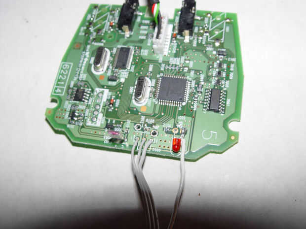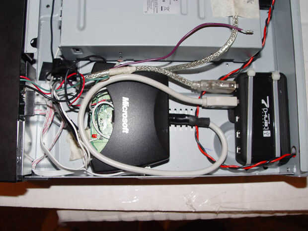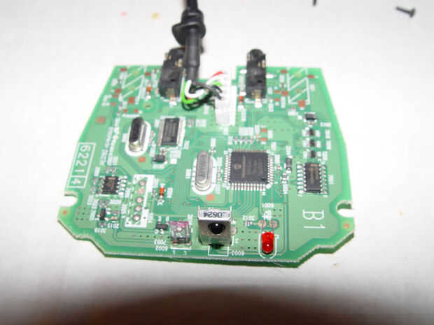 Nota que originalmente sólo soldado cables para conectar el sensor de infrarrojos a la similar conduce en circuitos frontal del reproductor de DVD. Quería probar si o no el receptor funcione correctamente con 2 sensores de IR en paralelo (sólo uno estaría expuesta a control remoto). El receptor sólo trabajó esporádicamente. En vez de solucionar problemas que quería subirse con él a desoldar el sensor de infrarrojos y soldadas con cerca de 8 pulgadas lleva a montarse en la parte frontal del reproductor de DVD (en frente del sensor de DVD player IR.) Espero que sería bastante simple (y mucho más elegante) para conectar los reproductores de DVD original sensor de IR a la placa de circuito del receptor remoto de Media Center correctamente. De esa manera el sensor original serían capaces de hacer su trabajo por usted sin necesidad de cualquier reposicionamiento.