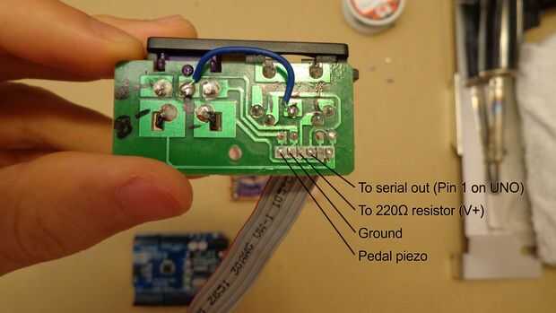 Tendremos que hacer una ligera modificación a la Junta del panel posterior. Mediante la adición de un puente entre las dos clavijas en la foto superior, podemos tierra el pin central del puerto MIDI que de otro modo sería falta de puerto de salida de un MIDI. Entonces podemos conectar los últimos cuatro pernos de la cinta de cable directamente en nuestro tablero de proto.