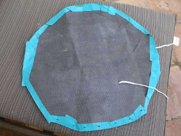 Para evitar que mi filtro de tela de desenredar Deformado los bordes con cinta adhesiva presionando sobre ambos bordes. No hice fotografía el siguiente paso pero poke 16 orificios para el cable de 8 en el exterior entonces establece su anillo en la lona y meter más en el interior de 8 alineación con los en el exterior. Una vez que ha hecho que se puede montar su titular por atar la lona con el anillo.