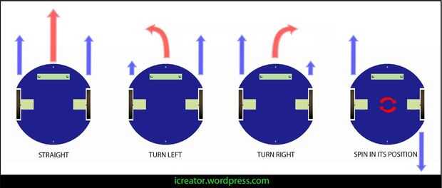 Cuando dos motores están conectados a las ruedas en línea, frente a la unos a otros (apenas como un par de ruedas conectadas a un solo eje) la velocidad con que gira cada motor determina la dirección del movimiento. Cuando ambos las ruedas giran a la misma velocidad la diferencia entre los motores es cero. Esto hace que el robot avance en línea recta. El robot puede moverse en dirección contraria si se invierte la dirección de la rotación de los motores de ambos. Otra vez se trata de una línea recta si la diferencia de velocidad es cero. Ahora cambiar la velocidad de cualquier motor resultará en movimiento en una dirección lejos de la línea recta. Por ejemplo, reduciendo la velocidad del motor derecho resultará en una diferencia de velocidad y por lo tanto, cambiar de dirección. La fuerza resultante es tal que el robot gira a la derecho. Este cambio de dirección puede controlarse al ángulo requerido reduciendo más la velocidad del motor. Más lento es el motor adecuado, más nítida es la vuelta a la derecha. Esto es exactamente lo mismo para la vuelta a la izquierda. Como conclusión, motor derecha más lento, más agudo a la derecha. Más lento izquierda motor más agudo de la izquierda. A continuación se presentan algunos escenarios que explica el funcionamiento del mecanismo diferencial. M1 y M2 son los motores que impulsan las ruedas izquierda y derecha respectivamente.