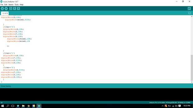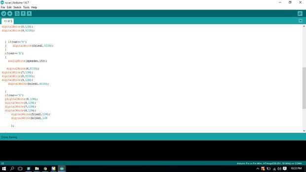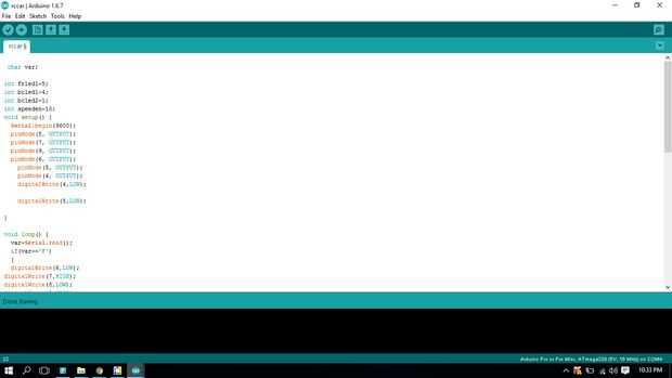 void setup() { Serial.begin(9600); pinMode(8, OUTPUT); pinMode(7, OUTPUT); pinMode(9, OUTPUT); pinMode(6, OUTPUT); pinMode(5, OUTPUT); pinMode(4, OUTPUT); digitalWrite(4,LOW); digitalWrite(5,LOW); } // the loop function runs over and over again forever void loop() { var=Serial.read(); if(var=='F') { digitalWrite(6,LOW); digitalWrite(7,HIGH); digitalWrite(8,LOW); digitalWrite(9,HIGH); } if(var=='H') { digitalWrite(frled1,HIGH); } if(var=='B') { analogWrite(speeden,150); digitalWrite(6,HIGH); digitalWrite(7,LOW); digitalWrite(8,HIGH); digitalWrite(9,LOW); digitalWrite(bcled1,HIGH); } if(var=='X') {digitalWrite(9,LOW); digitalWrite(8,LOW); digitalWrite(7,LOW); digitalWrite(6,LOW); digitalWrite(frled1,LOW); digitalWrite(bcled1,LOW ); } if(var=='L') {digitalWrite(6,LOW); digitalWrite(7,LOW); digitalWrite(8,HIGH); digitalWrite(9,LOW); } if(var=='R') {digitalWrite(6,HIGH); digitalWrite(7,LOW); digitalWrite(8,LOW); digitalWrite(9,LOW);; } } Espero que disfrutéis haciendo el proyecto, como lo he hecho les dejo algunos proyectos más interesantes pronto así que me siguen para obtener todas las actualizaciones también como mi página https://www.facebook.com/makewithRex/
