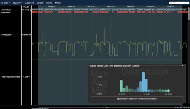 Se evaluó la actividad del hámster de mi hija, ZooZoo, durante los últimos cuatro días. Pueden ver una captura de toda su actividad capturado durante este tiempo en oleadas anteriores. En un rápido vistazo, puede ver los boquetes grandes en velocidad (y la línea plana de distancia total) que se correlacionan con las horas de luz cuando ella duerme. Aproximadamente 22:00 cada noche, ella consigue ocupada. Después de cuatro días, ella funcionó 12 millas! Si nos acerca a una de sus muchas carreras, parece que la imagen de arriba.