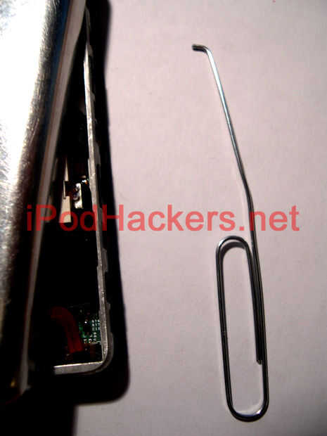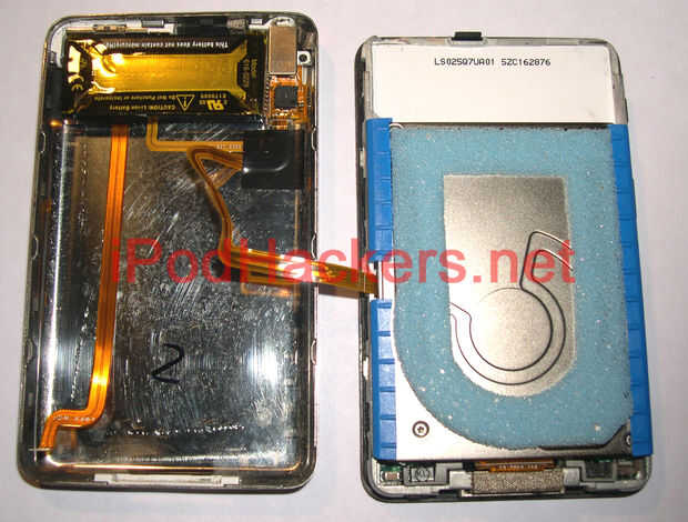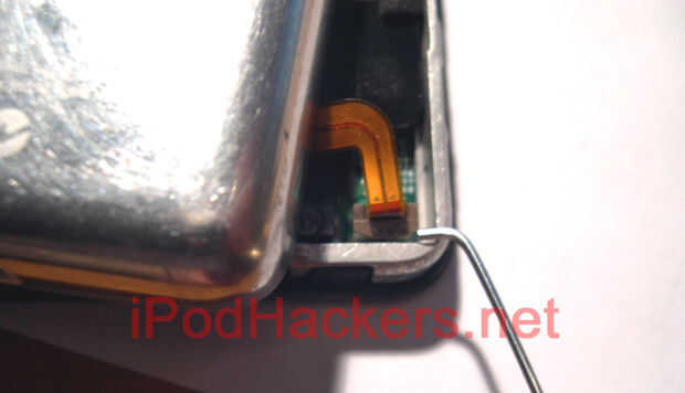 Tengo que advertir que si no ha abierto una unidad de 5G antes de, no sólo separe lo después de que se fracture el caso abierto. La batería está conectada mediante un cable de cinta en la esquina inferior derecha (ipod boca abajo). Utilice un destornillador pequeño o alguna otra herramienta para tirar para arriba en el conector para liberar el cable. Hice mi propia herramienta para hacer esto que yo siento que pone menos tensión en el conector.
