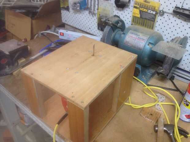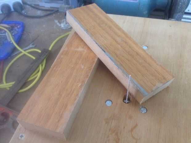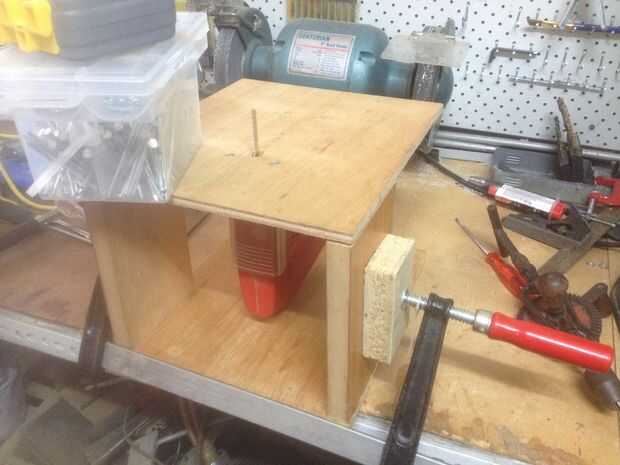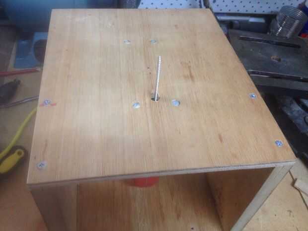 Coloque el conjunto del paso anterior sobre la base que hicimos antes y atornille desde arriba, recordando que las taladre y avellane los orificios. El juego no debe tocar la base, pero debe ser suspendido de la parte superior. Es importante que los tornillos queden al ras con la superficie superior, o que tendrán en el camino al intentar usar la Sierra de calar.