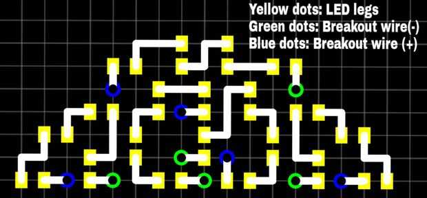 a continuación, dibuje un diseño de PCB según las dimensiones del agujero en el reflector. Puesto que usted quiere alimentar los LEDs con 12, 5V o más, necesita 5 columnas de cada 4 LEDs en serie en paralelo. Es importante mantener un ojo en la polaridad de los LEDs, ya que son diodos de emisión de luz. En las imágenes por encima de usted pueden ver mi disposición del PWB, cual puede copiar o utilizar como punto de partida para las variaciones según sus necesidades.