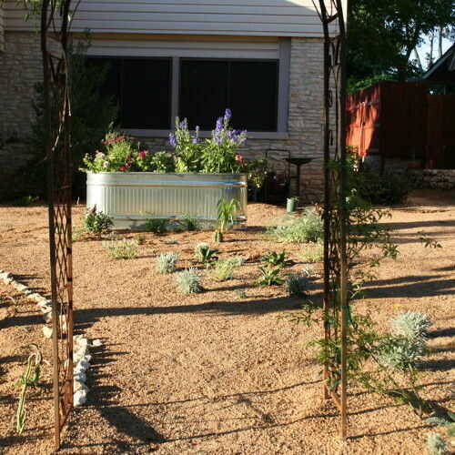 El tanque stock fue instalado, nivelado, lleno de tierra y plantado con plantas anuales de primavera-verano como albahaca y petunias.