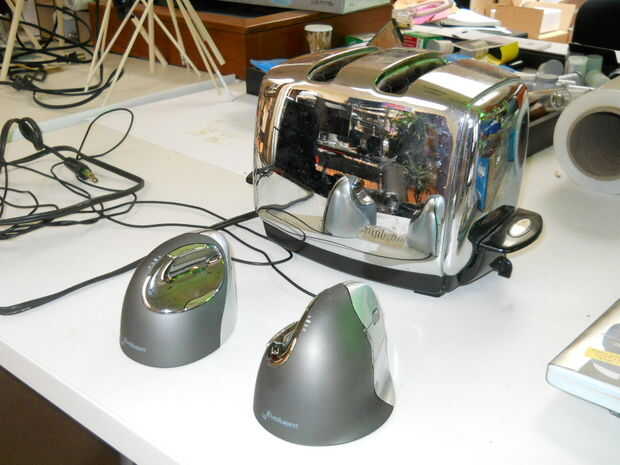 TIP: La pieza principal de esta escultura es una tostadora metálica y brillante. No quiere rayar su superficie por lo tanto, cada vez que tienes que trabajar en él (perforación, corte, soldadura) pone una protección suave entre la tostadora y la tabla.