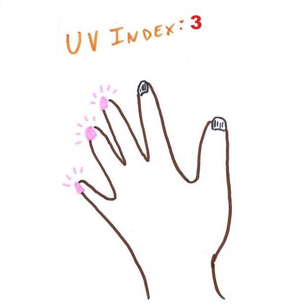 Todas las 10 uñas estará cubiertas con esmalte de uñas que cambia de color en la luz ultravioleta. Ocho dedos se dará más capas de clara, UV-bloqueo "capa superior." Todas las uñas se expondrá a la luz solar, y se registró el número de dedos que cambian de color (junto con la intensidad de la luz UV registrada por un medidor).