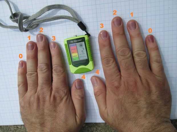 - Utilizando un medidor electrónico de luz UV, yo puedo calibrar el número de cambio de color los dedos a la escala del índice UV, girando las manos en los metros del índice UV.