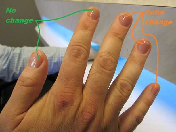 Afortunadamente, mi manicurista también fue un aficionado de la ciencia y sugirió que probar hacia fuera de la lámpara. En efecto, tres de mis uñas cambiaron color enseguida!