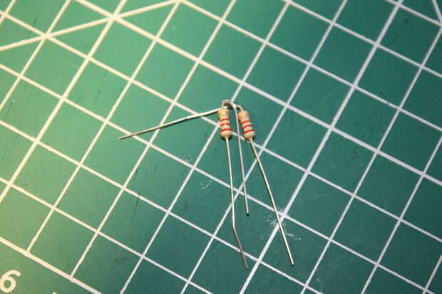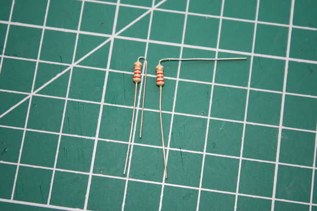 soldar las patas de su divisor de voltaje resistor a la placa de circuito como se muestra. Nota el pin central es la tensión de referencia y va hasta la unión entre las dos resistencias.