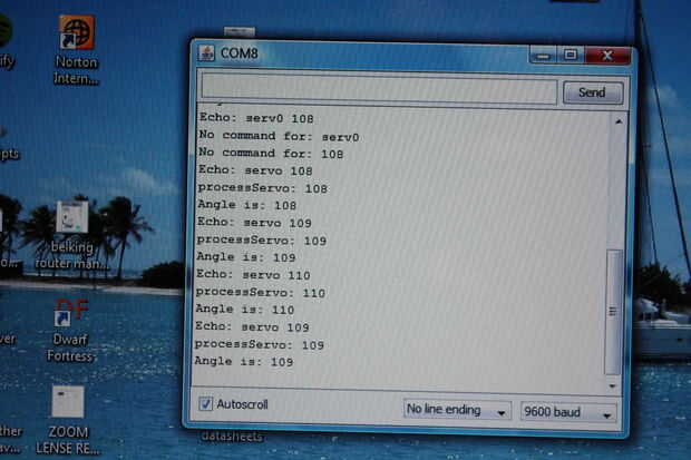 Desde que tuve las resistencias necesitaba determinar dónde estaba el punto centro de mi servo. Escribí un bosquejo simple arduino Lee un ángulo de entrada en el monitor serial y escribir este ángulo al servo. Haciendo esto que he encontrado los dos servos convierten el centro punto ángulo fue de 104 y 106 grados respectivamente. Envío de un ángulo mayor que esto hará que el servo gire en una dirección y un ángulo menor que causaría el servo girar la otra dirección.