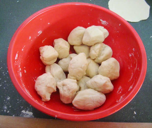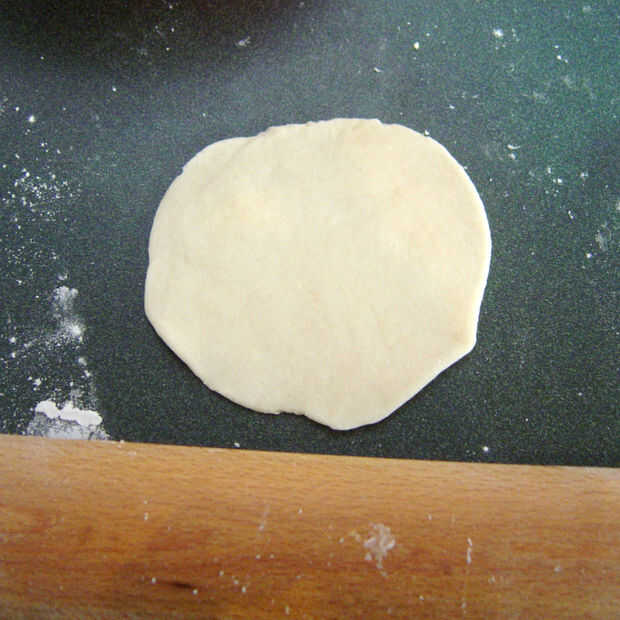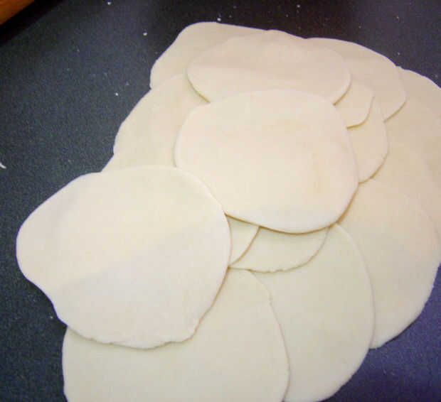 Estirar un pedazo de masa en un círculo. Puede que necesite el polvo de la cubierta y rodillo con harina para evitar que se pegue. Lo que está buscando un círculo del tamaño de su prensa de gyoza o cerca de 4 pulgadas si no estás usando una prensa. Desea que la masa sea muy fina. Que espese un poco mientras se cocinan.