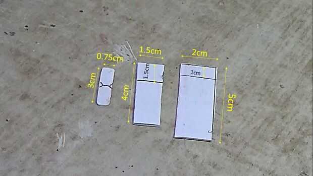 1 > tres pedazos pequeños de hoja de plástico. Dimensiones se dan en la imagen.