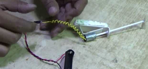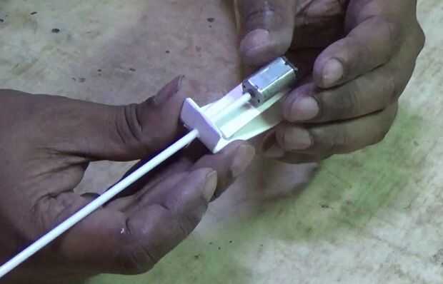 Ajuste firmemente el tubo al eje del motor y luego pegar en el plástico como se muestra en la imagen. Asegúrese de que el eje está girando libremente. pegar un pequeño trozo de thermocol en la parte inferior de la base.