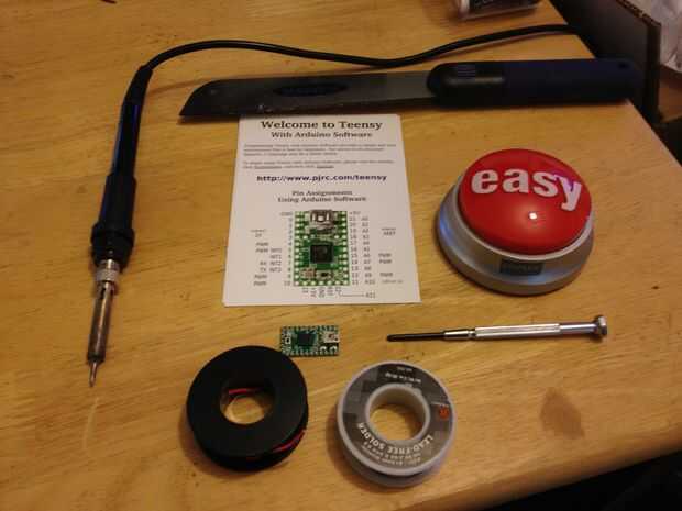 Herramientas necesitará una P0 o P1 destornillador philips, una soldadura de hierro y aproximadamente un pie de cable de conexión. Una sierra de marquetería o sierra para metales es útil para cortar el agujero para el puerto usb en el lado del botón, pero hacer bien un par de pinzas con el plástico relativamente blando, sólo se verá un poco más desigual. En la foto no son un cuchillo xacto o destornillador pequeño plano y un cortador pelacables.