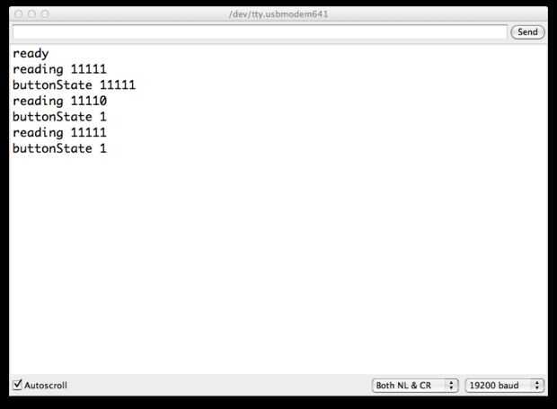 Abra el Monitor de la serie, verá mensajes de diagnóstico cuando se pulsa el botón. Si no, volver atrás y comprobar sus conexiones. Asegúrese de que ha soldado a las derecha trazas, y que ha cortado el rastro desde el botón.
